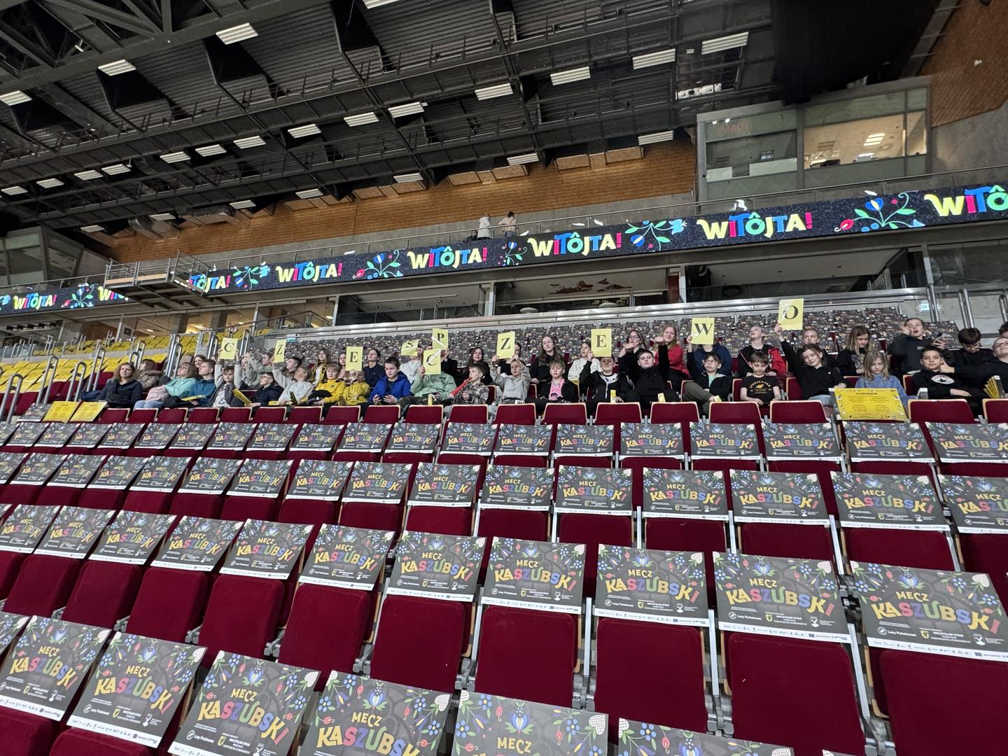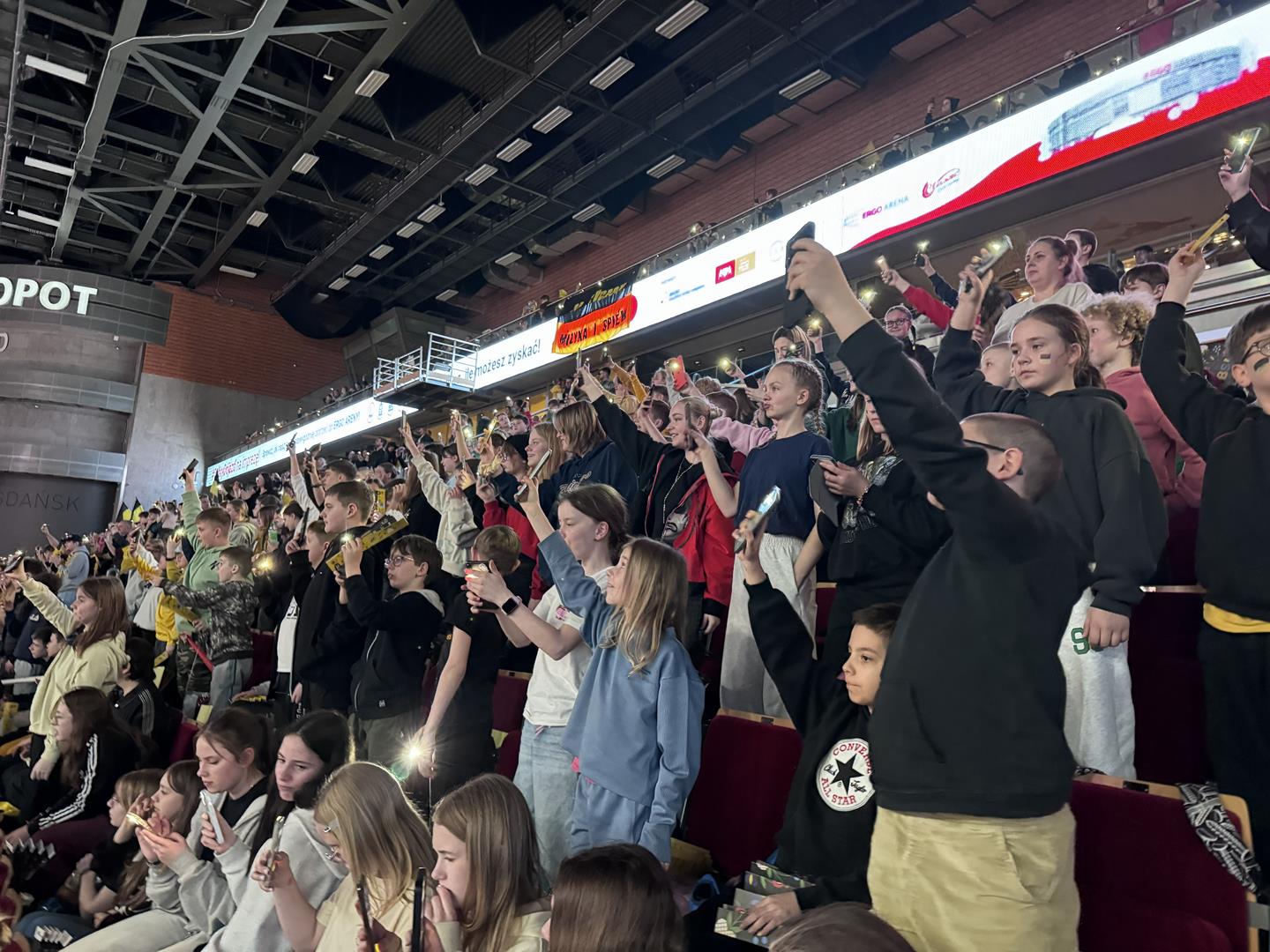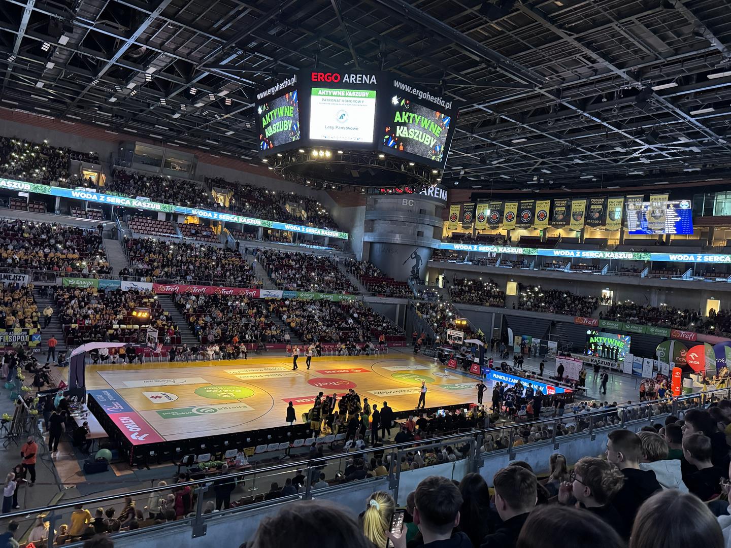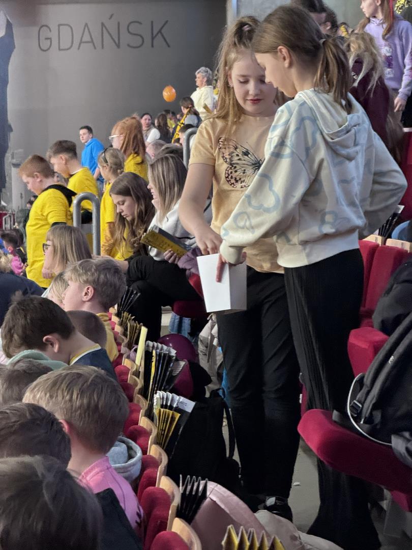 Następnym punktem był udział w Meczu Kaszubskim koszykówki na Ergo Arenie. Bilety zdobyliśmy dzięki udziałowi w konkursie plastycznym Aktywne Kaszuby dotyczącym tym razem działalności Róży Ostrowskiej. W czasie spotkania na Ergo Arenie wzięliśmy udział w przeróżnych atrakcjach przygotowanych przez organizatorów z tej okazji oraz oczywiście kibicowaliśmy zespołowi czarno-żółtych: Trefl Sopot, który niestety przegrał z MKS Dąbrowa Górnicza.